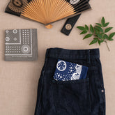 This bandana features tsukiiro, an indigo shade even deeper than standard navy. Traditionally used to depict the sea and waves, tsukiiro was also favored by samurai as a lucky color, since the character for “tsuki” is associated with “winning.” Its rich, dignified hue carries both cultural significance and timeless beauty.
