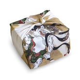The Wind God and Thunder God (Fujin ”風神” Raijin”雷神”) were originally messengers of the god Senju Kannon, and have been worshipped since ancient times. The image on this Furoshiki is a national treasure of Tawaraya Sotatsu's folding screen held by Kenninji temple. It is said to be the masterpiece of his later years, with its tense composition, illusionary clouds created by the Tarashikomi technique, and the fierce dynamism and powerful presence of the two deities.
