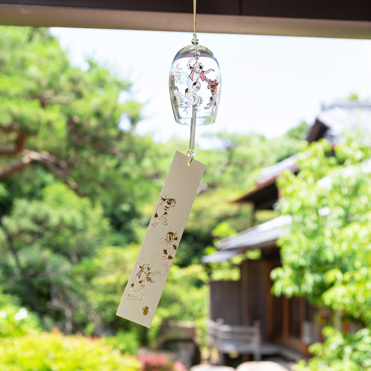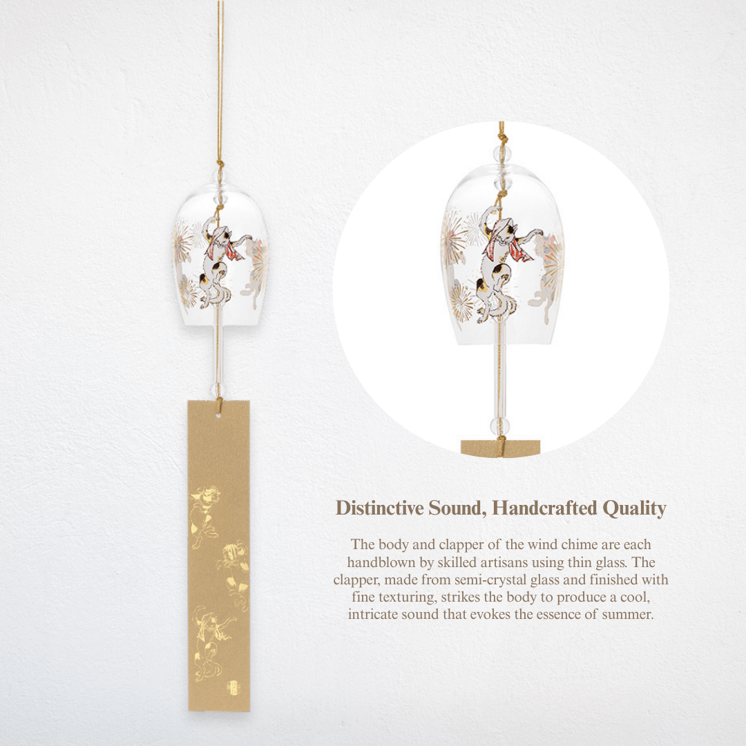 Each piece features a festive scene of a cat dancing in a summer yukata, wearing a tenugui on its head, surrounded by golden fireworks that sparkle as the wind chime sways. The design is lovingly printed onto handblown glass using contemporary techniques, blending traditional Japanese aesthetics with refined craftsmanship.