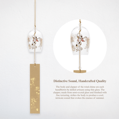 The chime's clear, cooling tone is created by a delicate, thin-blown glass body and a specially crafted clapper made from semi-crystal glass. With fine surface textures, the clapper strikes the glass to produce a beautifully layered sound that enhances your summer ambiance. Each chime is individually handmade by skilled Japanese glass artisans, giving it a unique character in shape, weight, and detail.
