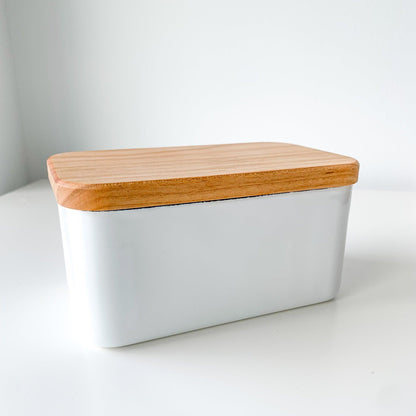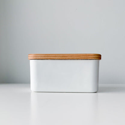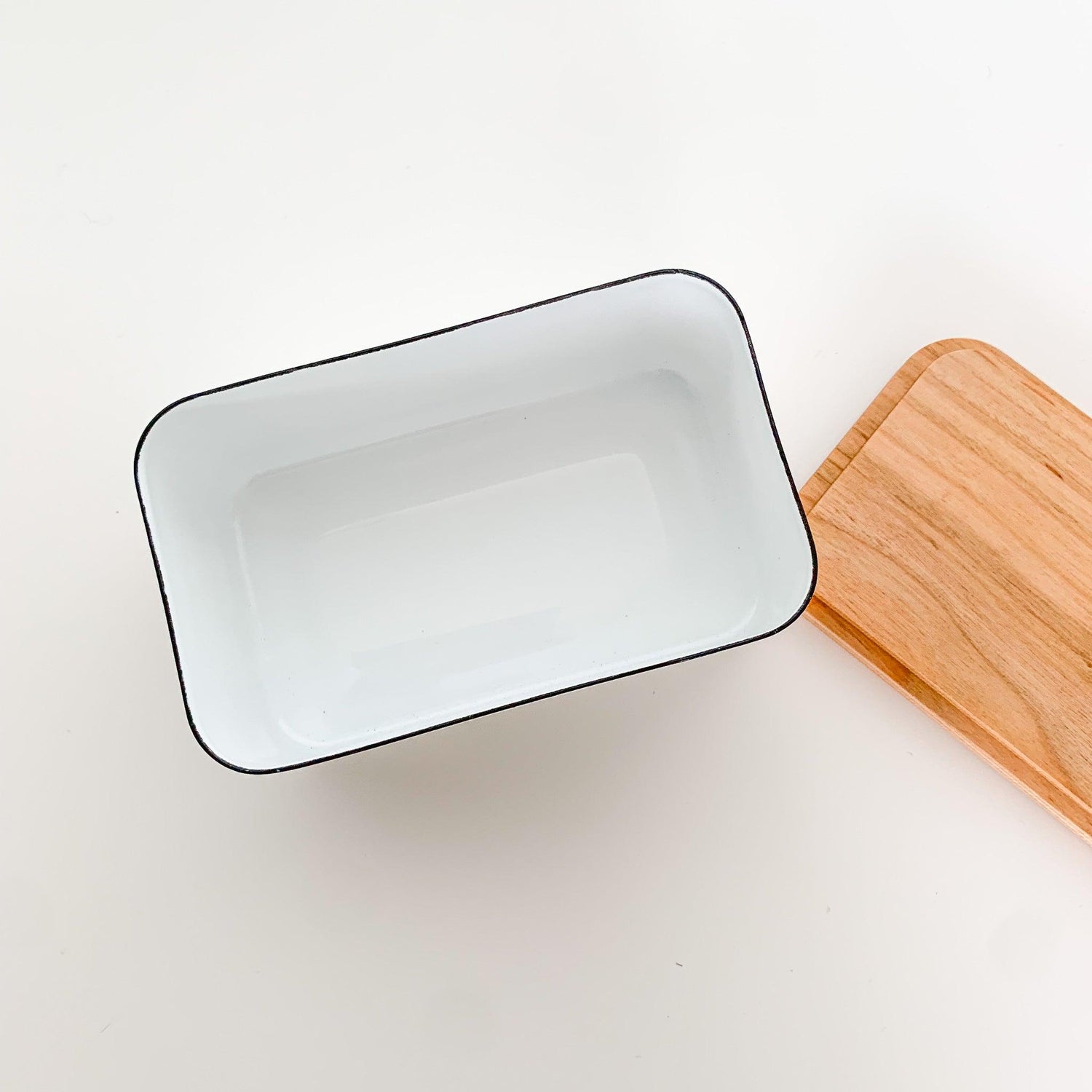 Butter dish of enamelware with beeswax coated natural wood (Sakura tree) lid. Enamelware has a great cooling effect and prevents food odour transfer.
