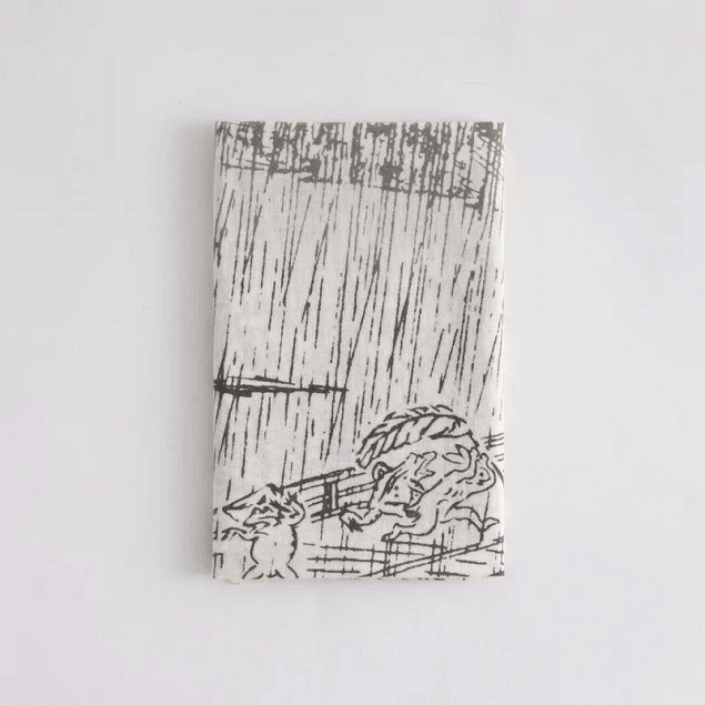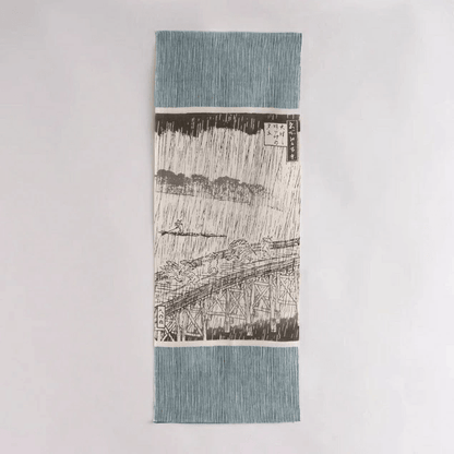 This tenugui towel beautifully blends elements from two iconic pieces of Japanese art: the whimsical animals from the "Chōjū-Giga" scroll, known as the origin of manga, and Utagawa Hiroshige's renowned "Sudden Shower over Shin-Ōhashi bridge and Atake " .
