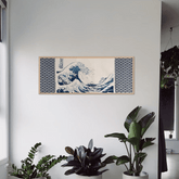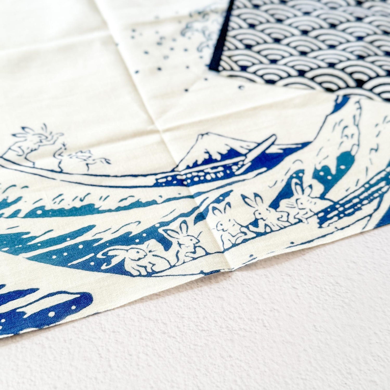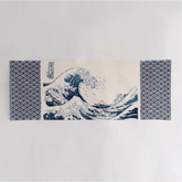 This tenugui towel beautifully blends elements from two iconic pieces of Japanese art: the whimsical animals from the "Chōjū-Giga" scroll, known as the origin of manga, and Katsushika Hokusai's renowned "The Great Wave off Kanagawa," paired with the traditional Japanese fabric pattern ”Seigaiha (Blue Wave) ".