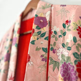 Sourced from a vintage kimono collector based in the Northern Kyushu region, this piece showcases a beautiful floral design. It features wildflowers like camellias, chrysanthemums, and autumn leaves that paint the late-autumn mountains of Japan. The vibrant red lining is characteristic of traditional Japanese kimonos and is often used in older kimonos, symbolizing protection for the wearer.