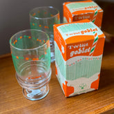 Only two glasses are available, both in their original box, which shows natural signs of aging yet still proudly displays the delightful typography and design of the era.