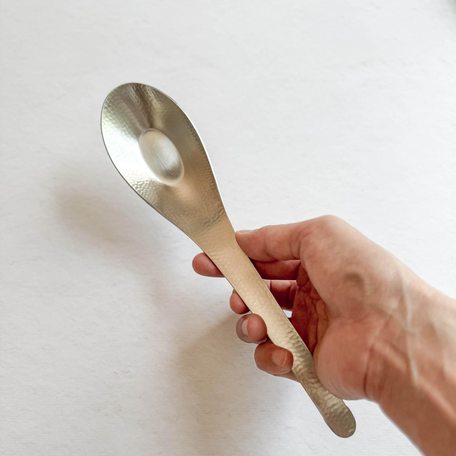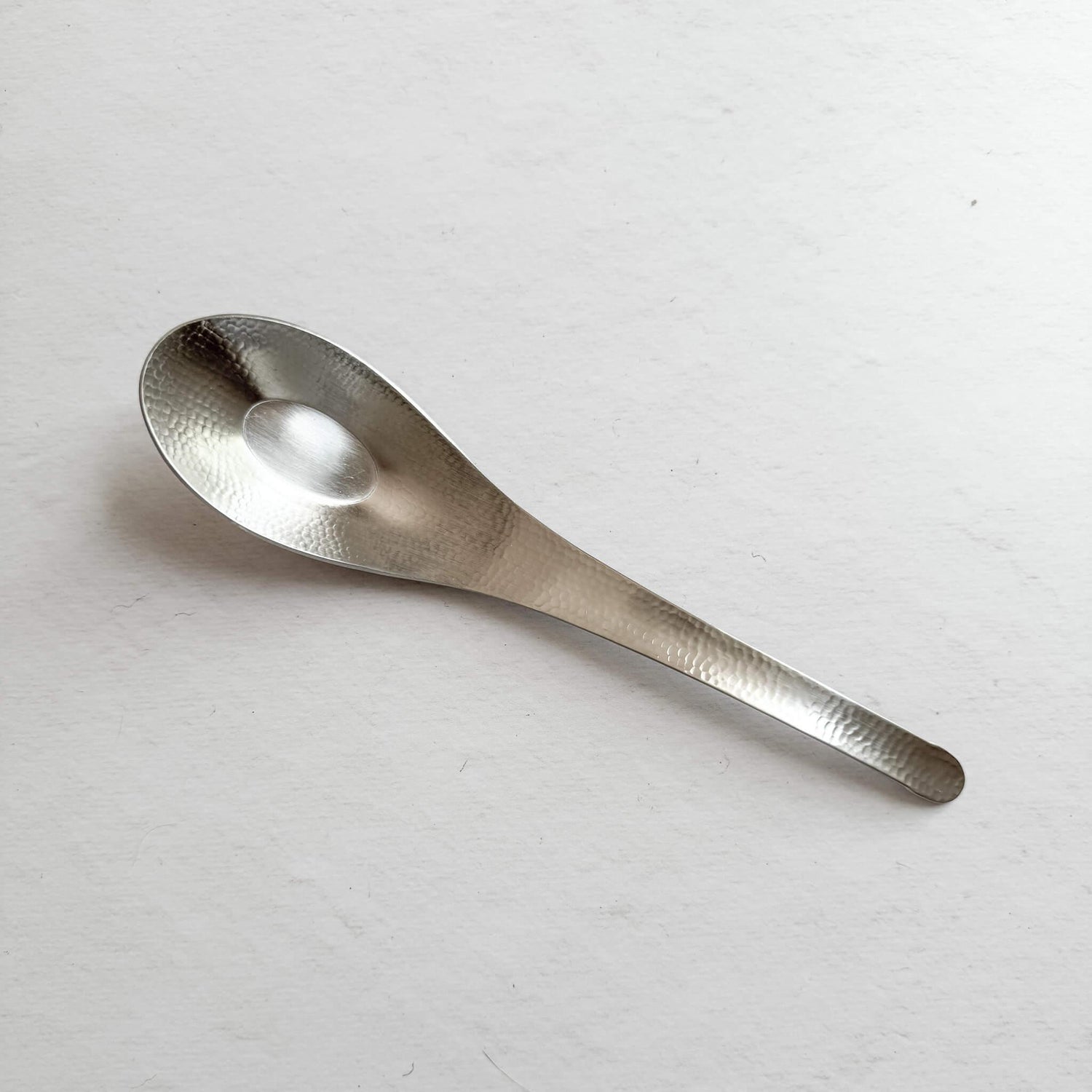 Beautiful Asian soup spoon made of hammered finish matte stainless steel by a small metalworking factory in Tsubame City, Niigata Prefecture, a place famous for its high stainless steel processing technology.