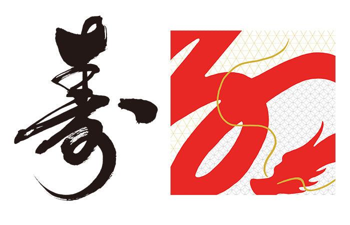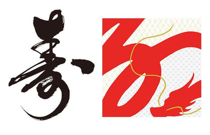 The word “寿 Kotobuki" in cursive script is expressed in a long dragon body. The body is positioned so that it protrudes from the furoshiki to show the dynamic presence of the dragon. The simple silhouette depicts a dragon flying freely with its golden whiskers gently fluttering.