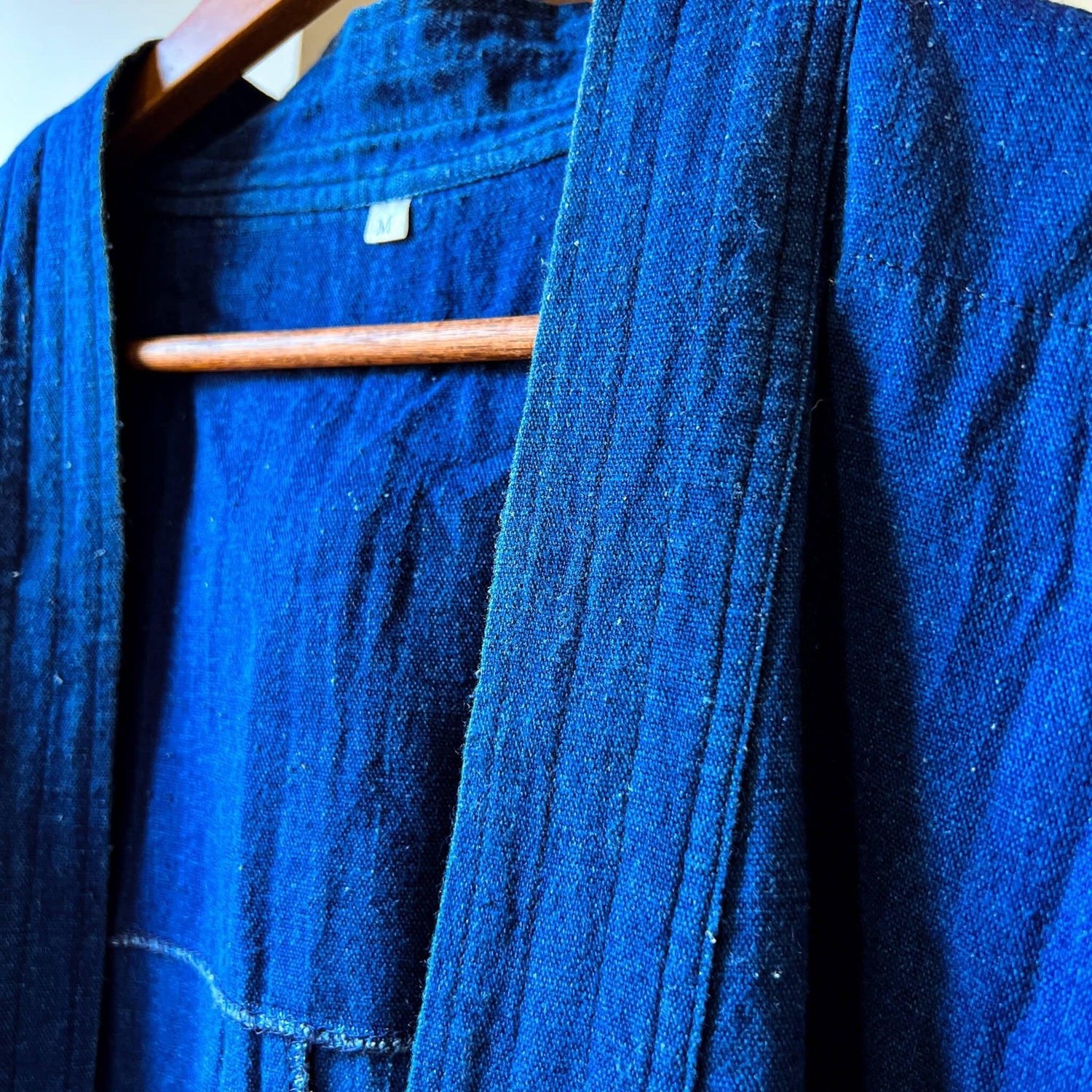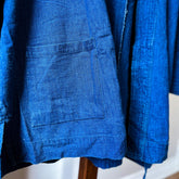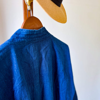 This jacket is a traditional Japanese Samue, which is an iconic work attire. It holds a rich and unique texture, characteristic of used indigo dyed garments. Though it isn't particularly old, it still showcases the distinct appeal and feel that indigo dye offers.